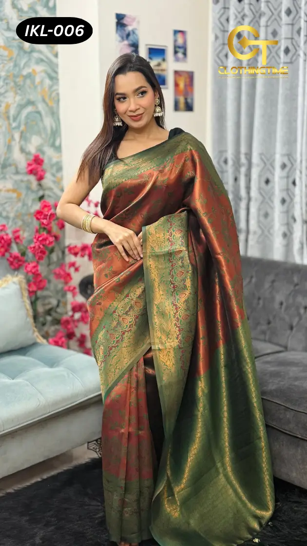 South Indian Kanchipuram Saree at ClothingTime.com ভারতীয় ঐতিহ্যবাহী শাড়ির মধ্যে সবচেয়ে মর্যাদাপূর্ণ ও রাজকীয় এক নাম। তামিলনাড়ুর ঐতিহাসিক কানচিপুরম অঞ্চলের দক্ষ তাঁতশিল্পীদের হাতে শতাব্দীপ্রাচীন বুনন কৌশলে তৈরি এই শাড়িগুলো তাদের ভারী সিল্ক, সমৃদ্ধ রং ও নিখুঁত জরি কাজের জন্য বিশ্বজুড়ে পরিচিত।